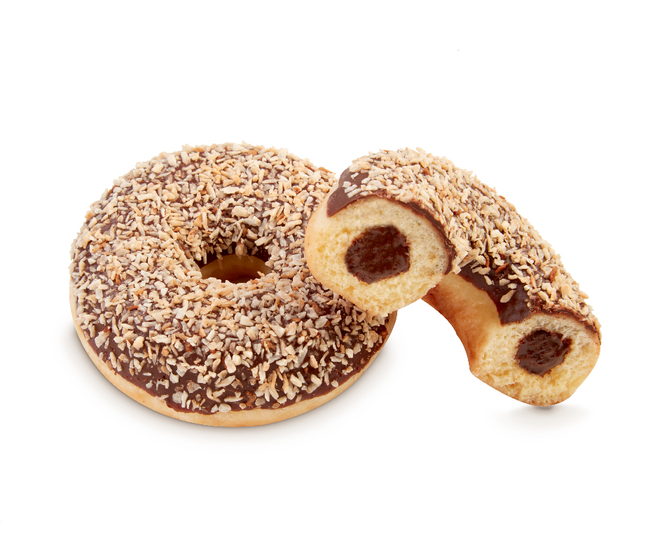 La media cobertura de cacao de nuestro Dots Coconut está rebozada con coco rallado caramelizado, y su relleno de crema al cacao cuenta también con el indispensable toque del coco. ¡Irresistible!