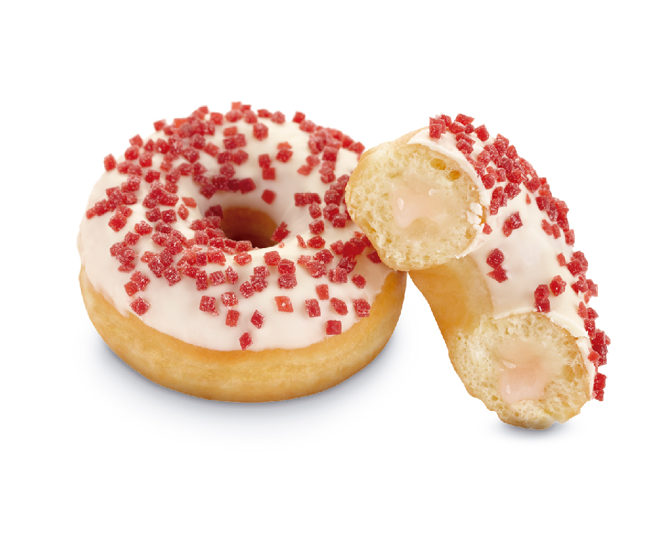 Para los más golosos. Con crema de fresa por dentro y bañado con media cobertura de chocolate blanco y pepitas de gelatina de fresa.