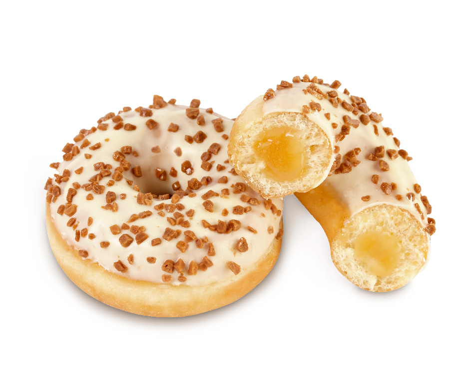 Dots relleno de caramelo con cobertura de choco blanco y crunch de caramelo.