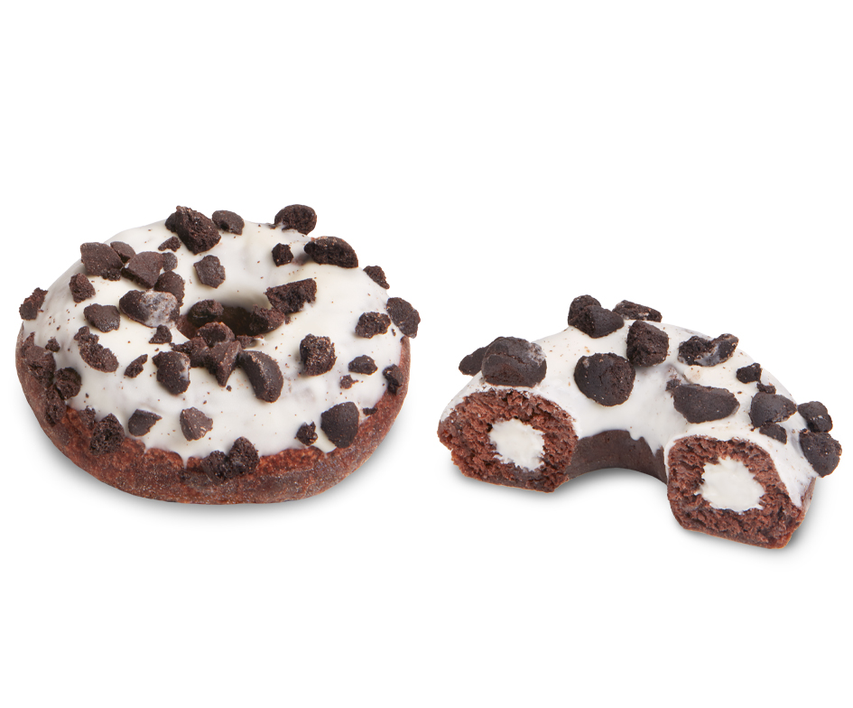 Rellenamos nuestra tierna masa de Dots® al cacao con una dulce y blanca crema láctea y coronamos nuestra deliciosa creación con media cobertura de bombón blanco y pequeños trocitos de negra galleta al cacao.