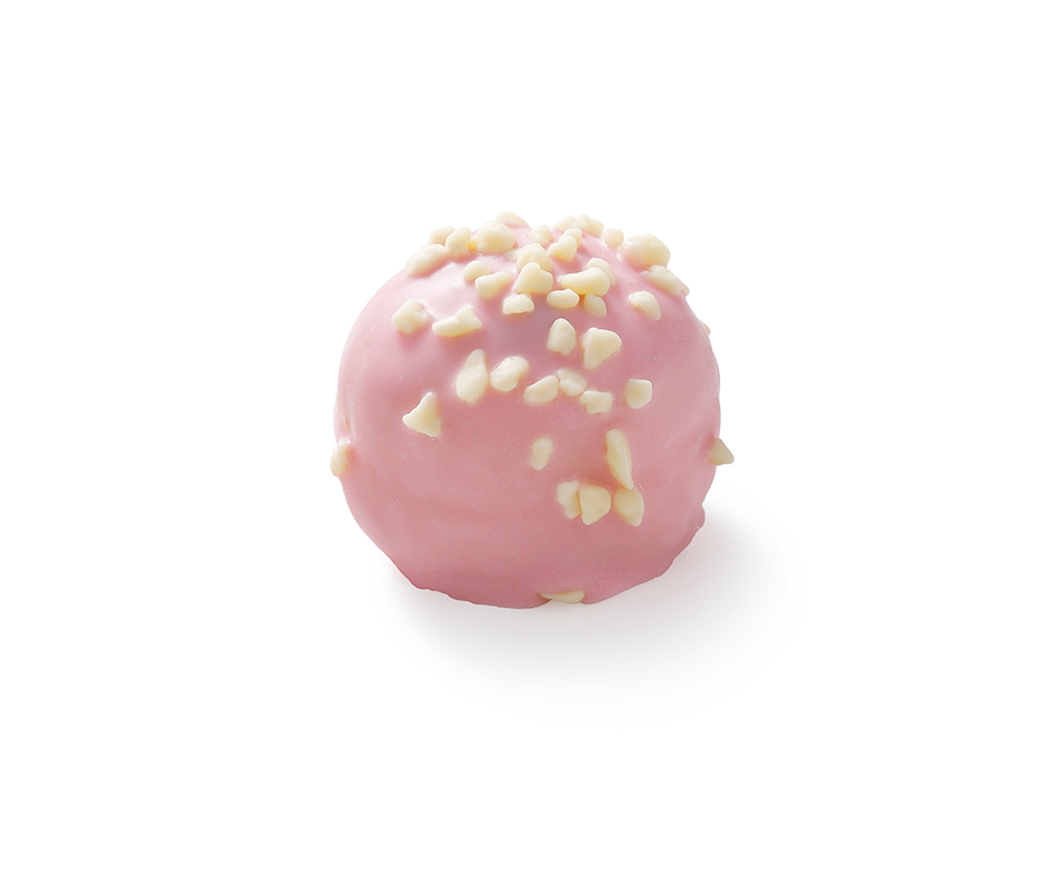 Rellenamos esta bolita de masa de Dots® con mermelada de fresa, la envolvemos con una cobertura de bombón rosa y la enriquecemos con un atractivo topping de perlas de bombón blanco. ¡Explosión de sabor!