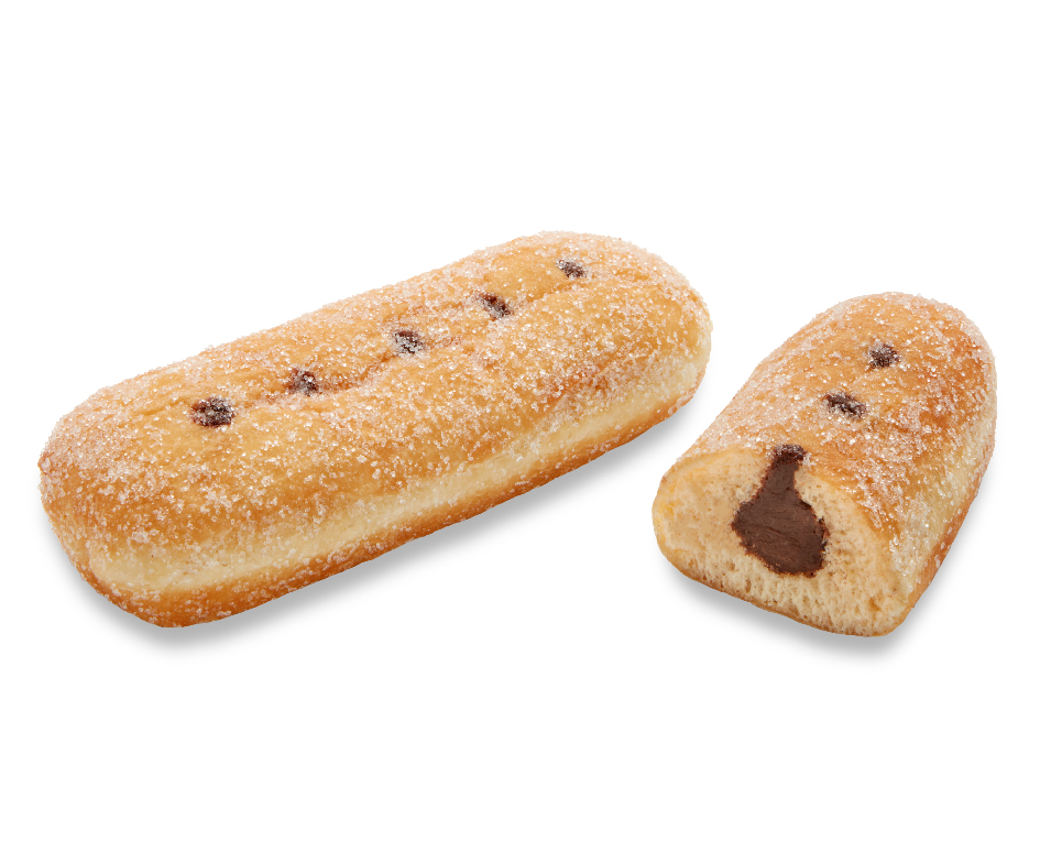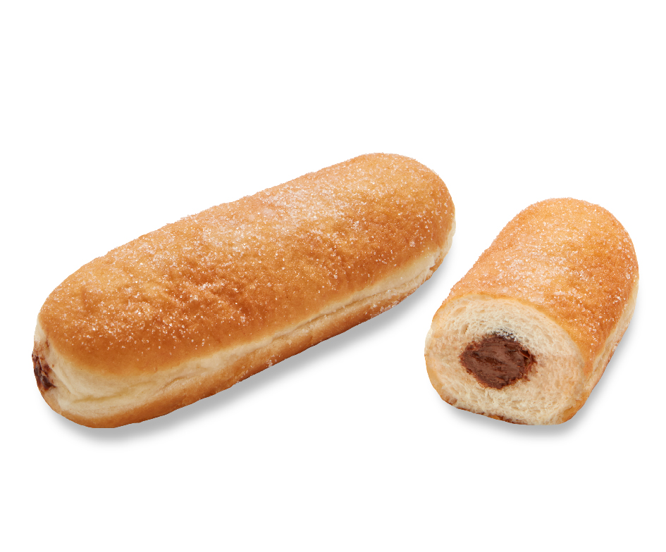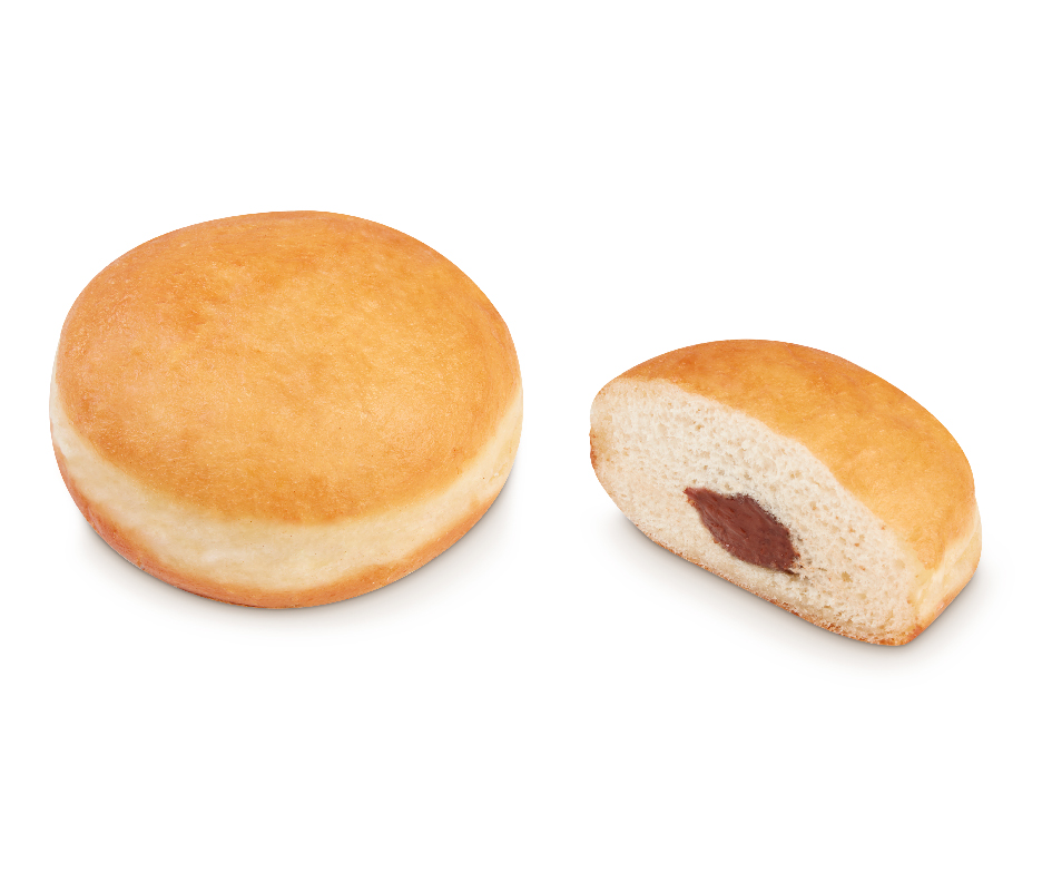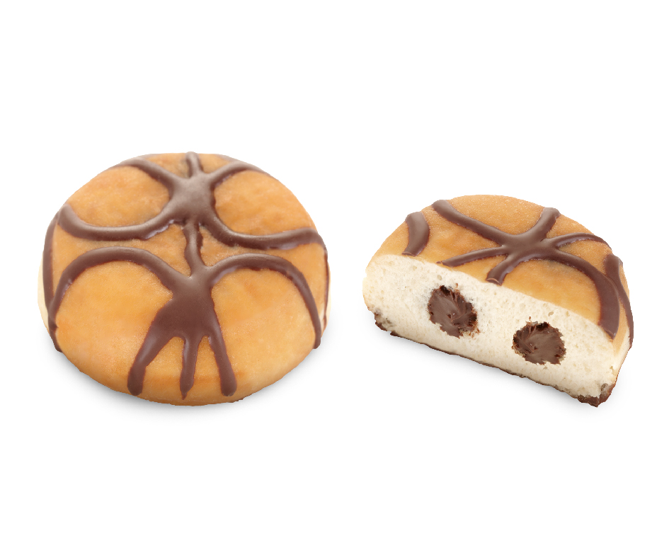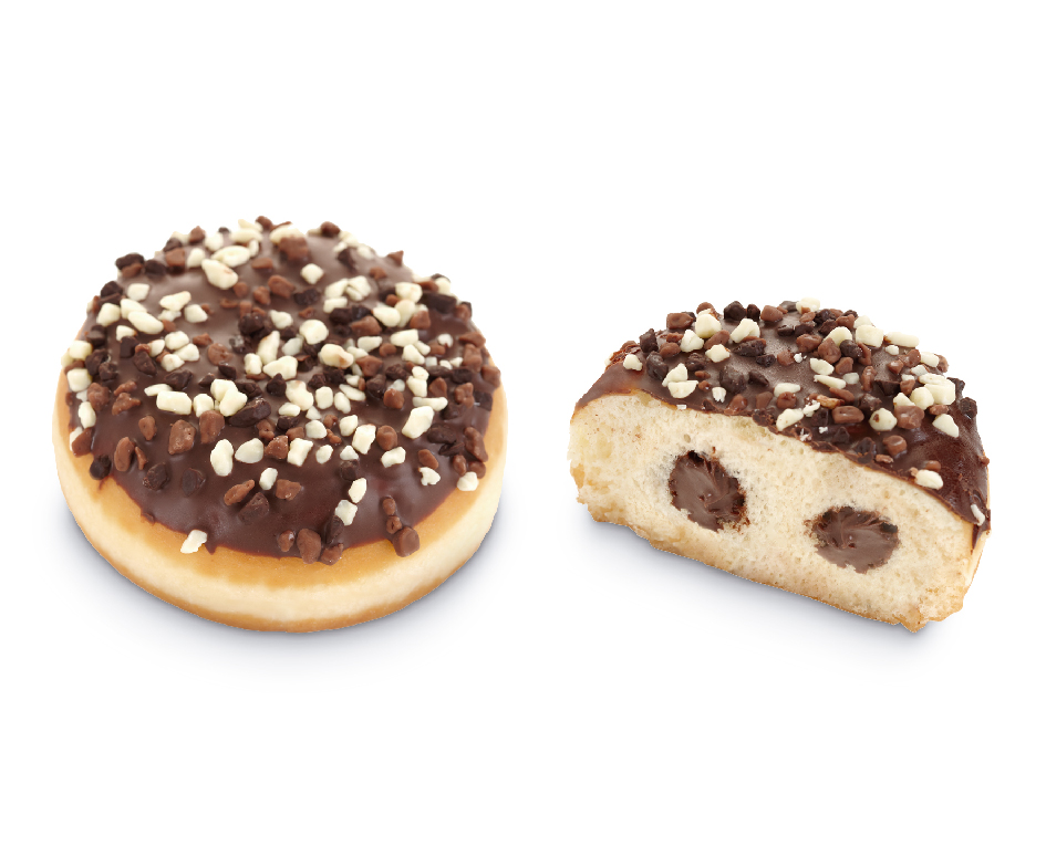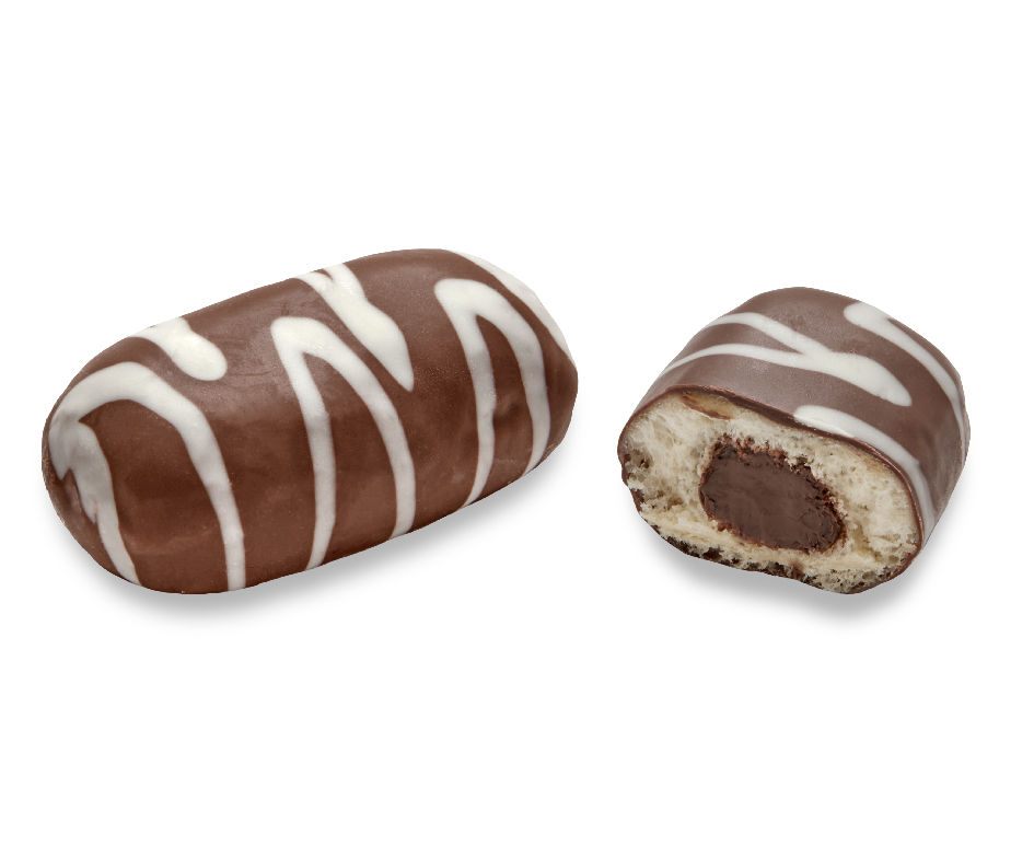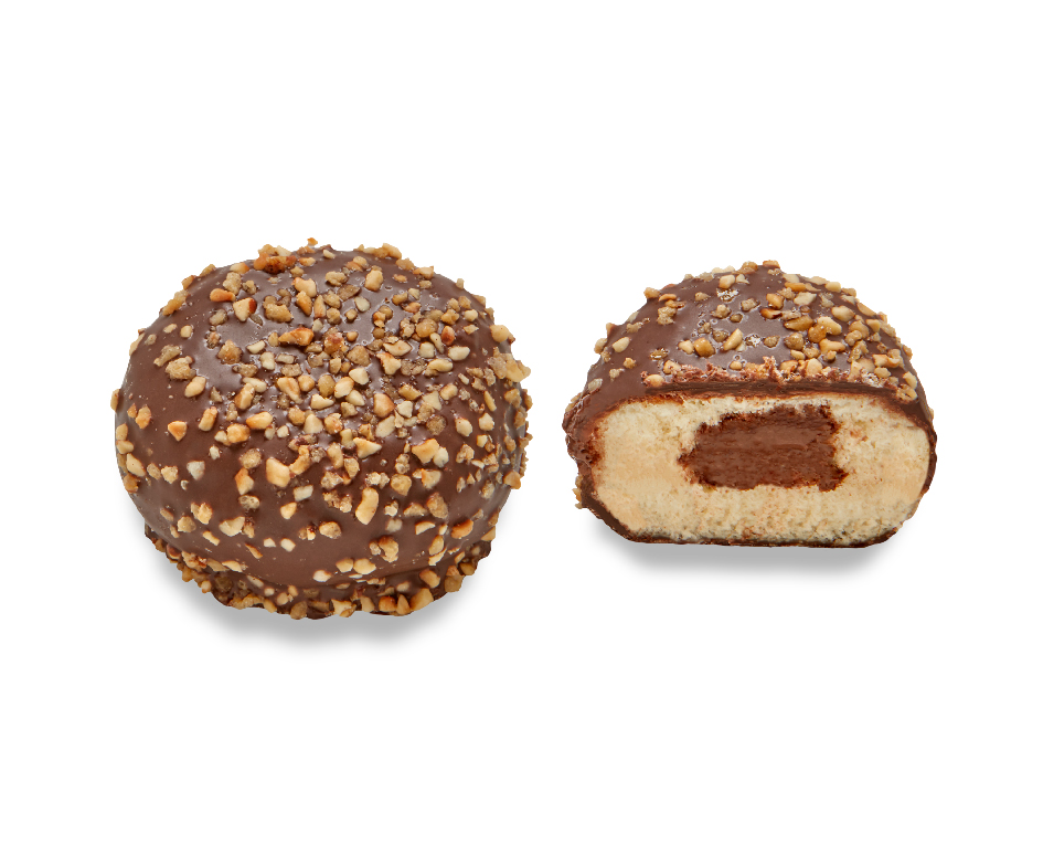Very soft and spongy dough. Coated in chocolatey and decorated with small hazelnut pieces. With a triple injection of milk chocolate filling.