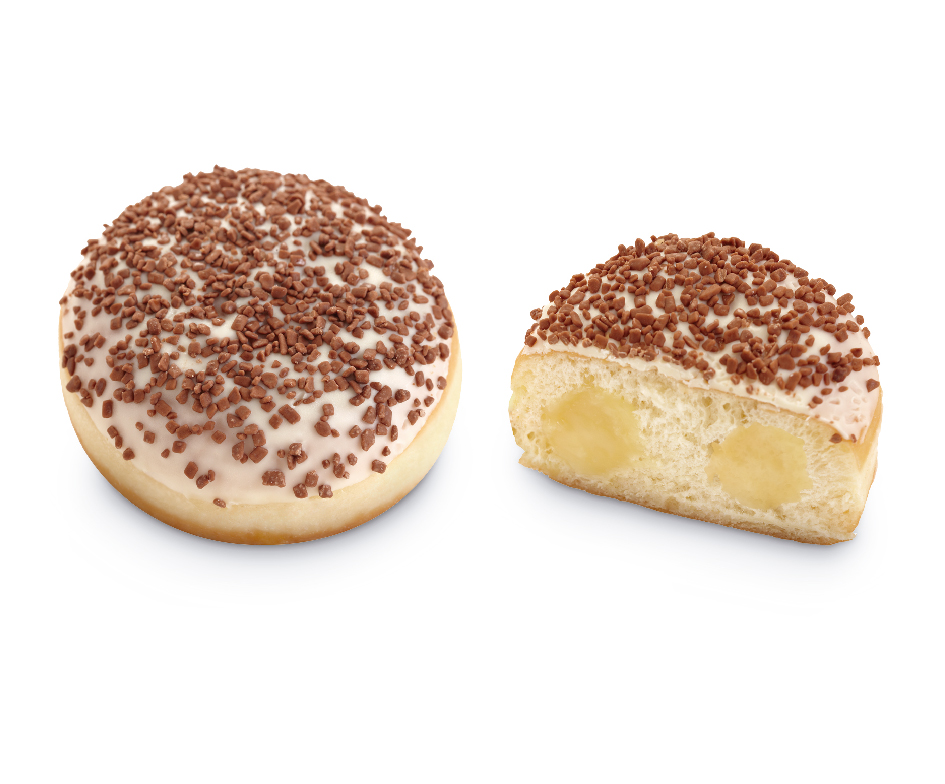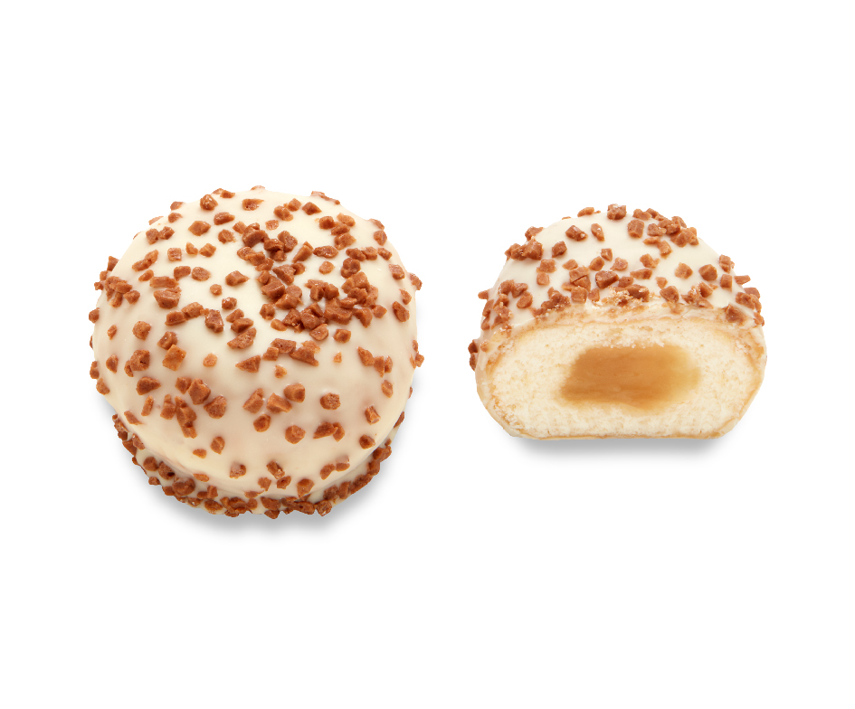 Very soft and spongy dough. Coated in chocolatey and decorated with small pieces of caramel crunch. With a triple injection of caramel cream filling.