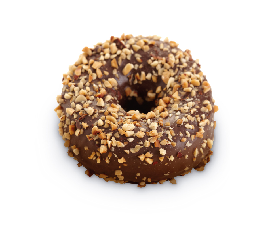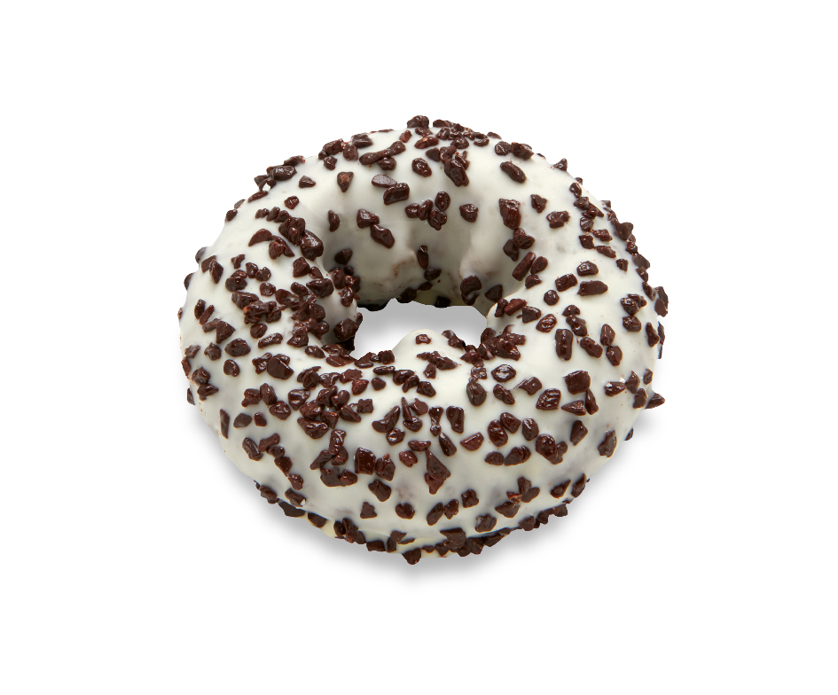 An exquisite cocoa laden cake doughnut for anyone craving a rich chocolaty flavor experience. This eye-catching doughnut will stand out in a display case, enrobed in a white icing and scattered everywhere with cocoa flavored bits.