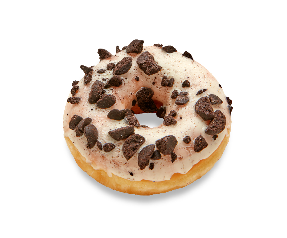 Our spongiest, softest dough has been given an even more innovative twist with this artisan decoration. Each piece has its own, irregular finish that lends the product an original look. With a white half coating decorated with cocoa cookie pieces.