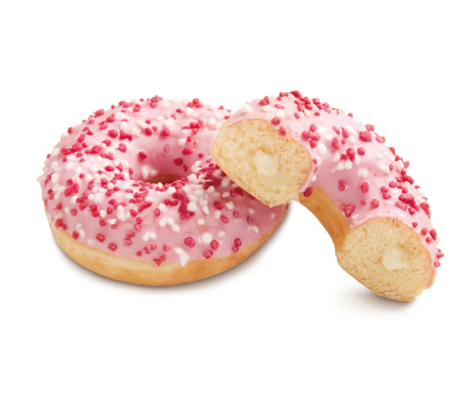 Half coated with pink icing and topped with strawberry and cream flavour sugar balls and filled with delicious white chocolate cream.
