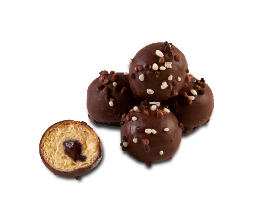 Chocolate cream filling and coated in classic chocolate, decorated with milk, dark and white chocolate balls.