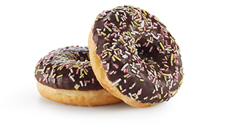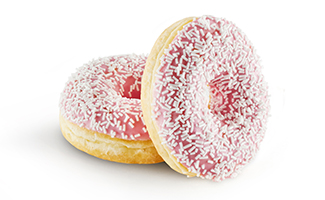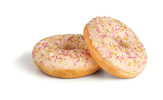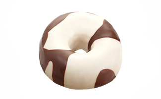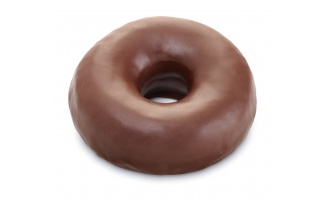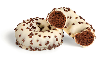 An exquisite cocoa laden cake doughnut for anyone craving a rich chocolaty flavor experience. This eye-catching doughnut will stand out in a display case, enrobed in a white icing and scattered everywhere with cocoa flavored bits.