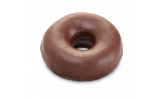 This classic Ring Dot has a soft dough decorated with a layer of dark cocoa flavored coating and pastel colored sprinkles on top.