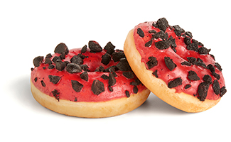 A bright red and beautiful cheesecake flavored coating with chocolate cookie crumbles.
