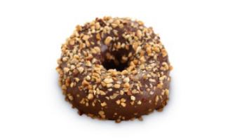Soft dough dipped in cocoa and decorated with pieces of hazelnut on top.