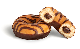Our perfectly soft Dots dough with a surprise inside: a creamy European style cocoa & hazelnut filling: drizzled with delicate cocoa stripes.